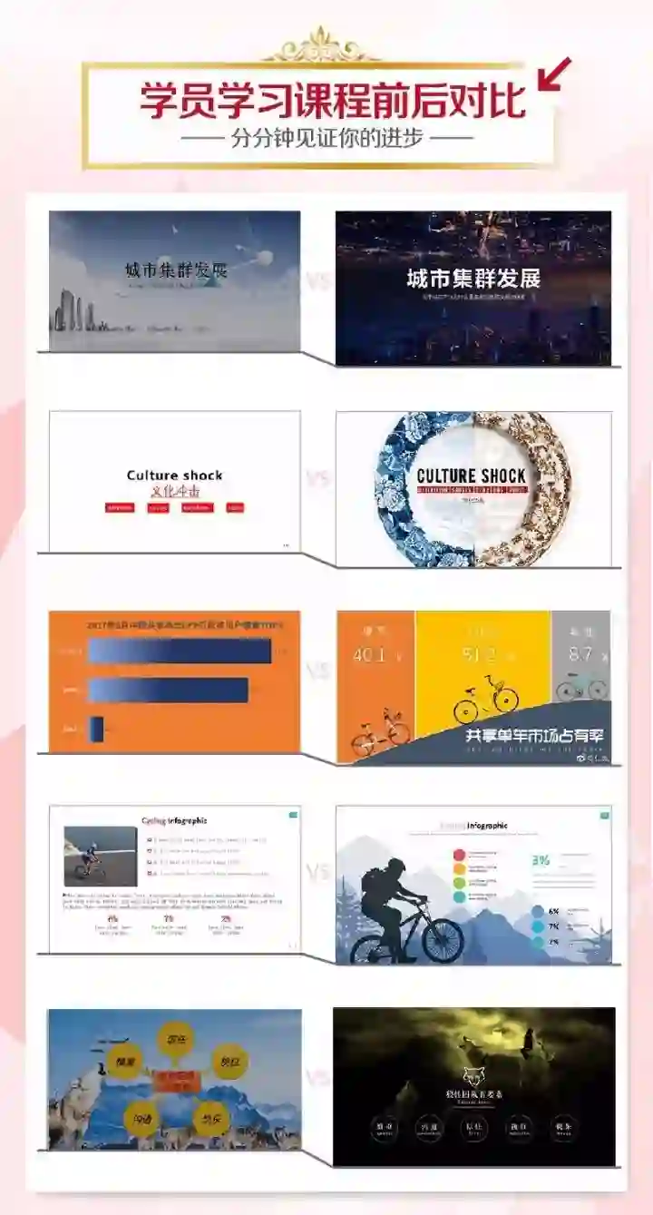 3、学习法超正:通过before & after案例详解PPT思路与步骤,提升在不知不觉中进行;更有课后作业布置及点评,及时反馈。