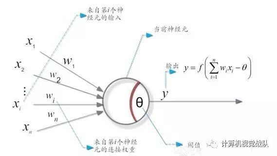 在这个模型中,神经元接收来自n个其它神经元传递过来的输入信号,这些信号的表达,通常通过神经元之间连接的权重(weight)大小来表示,神经元将接收到的输入值按照某种权重叠加起来,并将当前神经元的阈值进行比较,然后通过“激活函数(activation function)”向外表达输出(这在概念上就叫感知机),如图3-2所示。