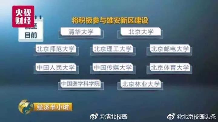 教育部也在统筹整合教育资源,加大高等院校的疏解力度,截至目前,近百所在京高校中已有清华大学、北京大学、北京师范大学、北京理工大学、北京邮电大学、中国人民大学、中国传媒大学、北京体育大学、中国医学科学院、北京林业大学等十余所学校相继表态,将积极参与雄安新区建设。