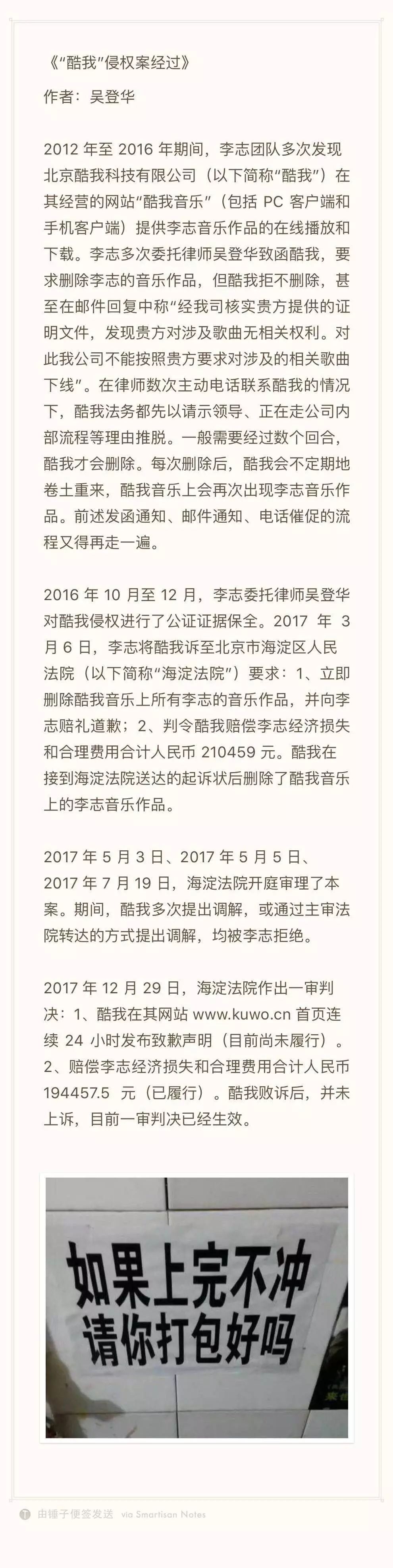 此事终于在2017年12月有了“说法”——海淀法院判决:酷我发致歉声明;赔偿李志19万人民币。