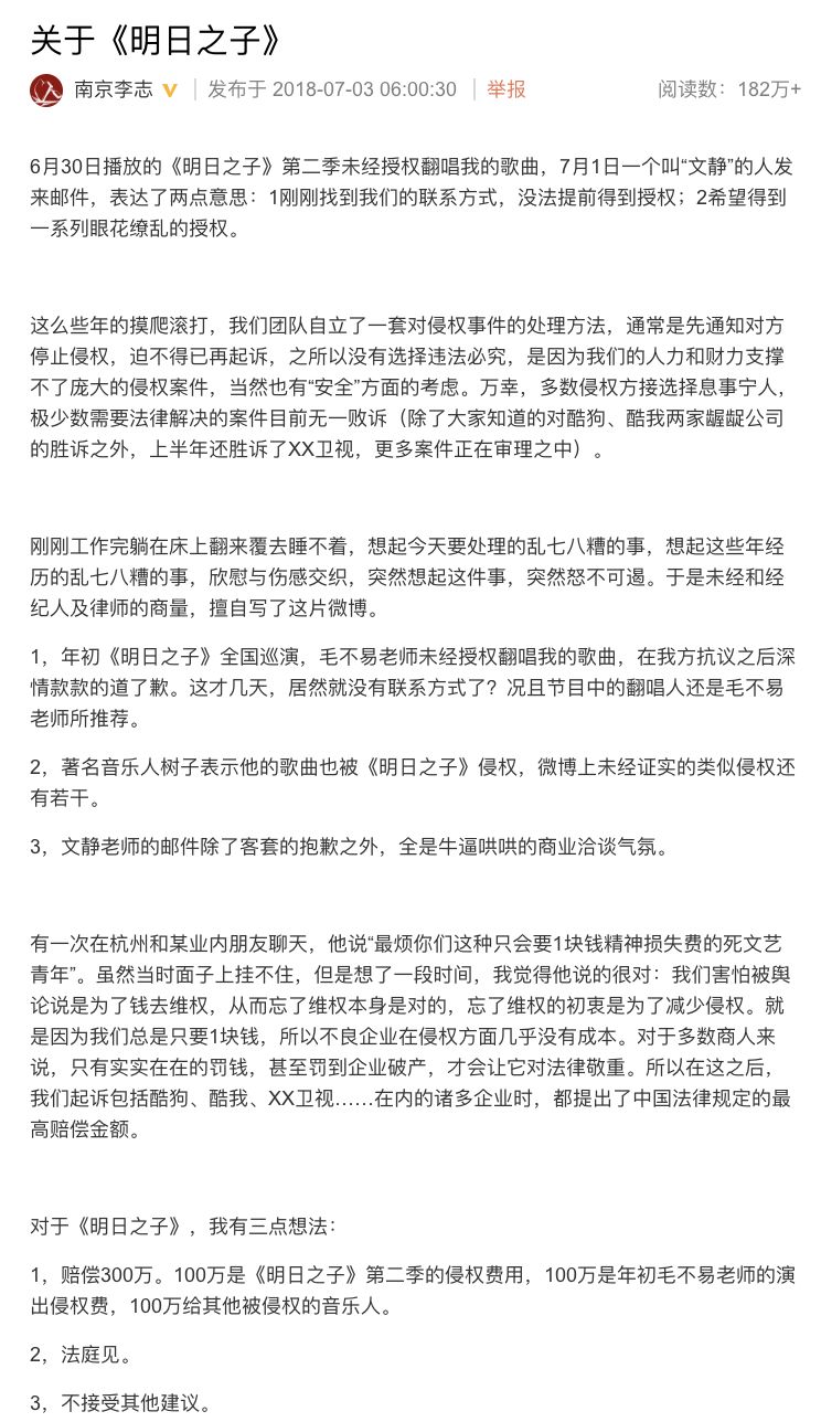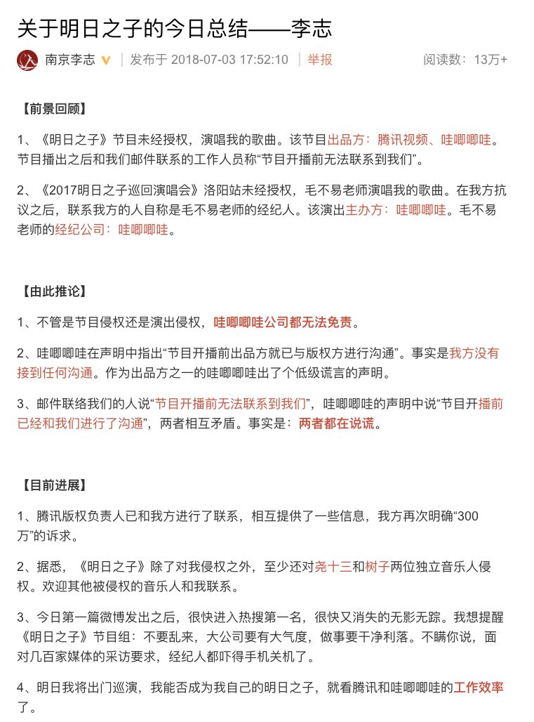 今天(7月3日)下午六点左右,李志在微博发了一篇长文,总结了事件过程——