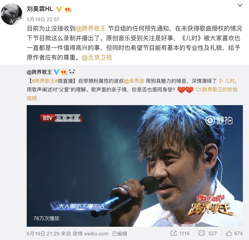 同期,吴秀波在《跨界歌王》中翻唱了刘昊霖的《儿时》,并且上架到音乐平台,且需要付费收听。节目播出后立马引来了原唱刘昊霖的不满,他发文斥责:未接受到任何通知,在未获得授权的情况下就录制和播出,希望节目组可以给予原作者应有的尊重。