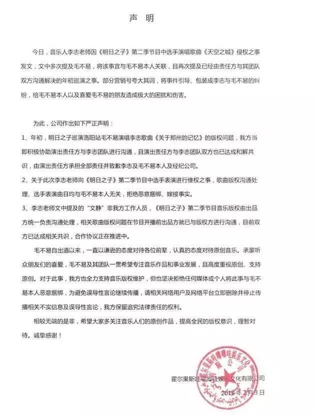 1月20日,毛不易在“明日之子”的巡回演唱会上翻唱了李志原创的《关于郑州的记忆》。1月23日,李志在微博发声: