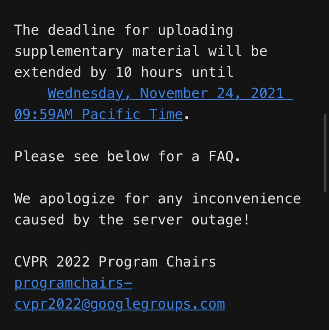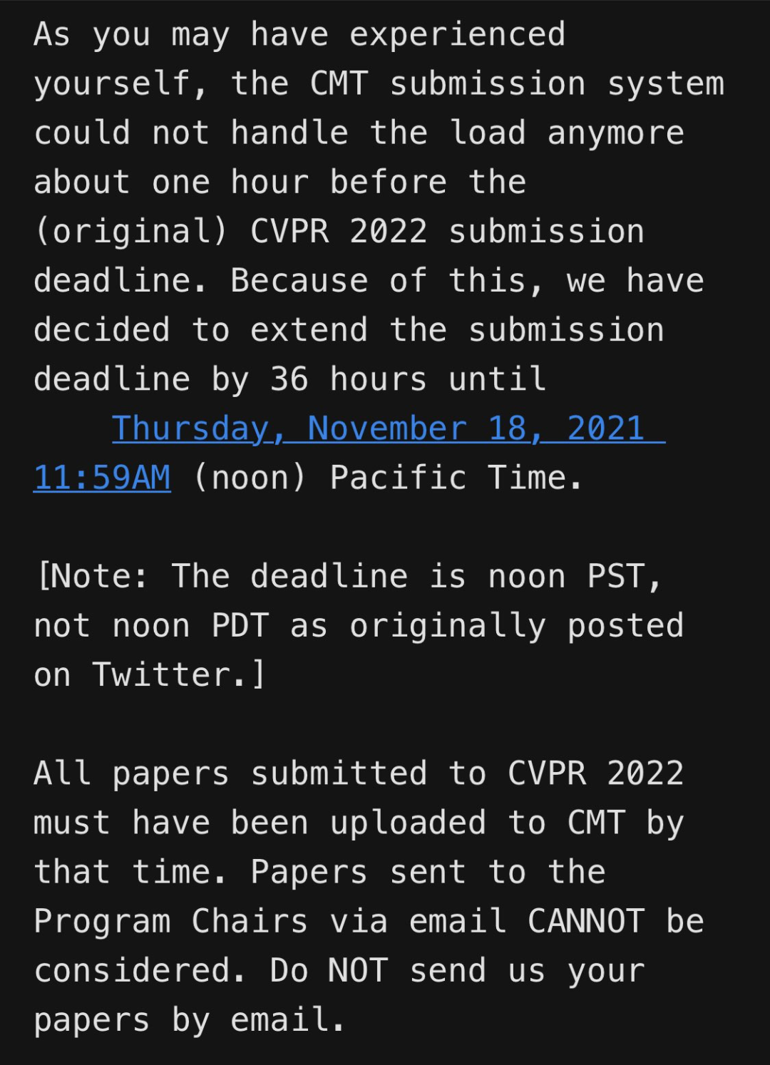 正如你可能亲身经历的那样,在原定的CVPR 2022提交截止前的一小时,CMT提交系统无法承受负荷宕机了。正因为如此,我们决定将提交截止日期延长36小时,至太平洋时间2021年11月18日星期四上午11:59。