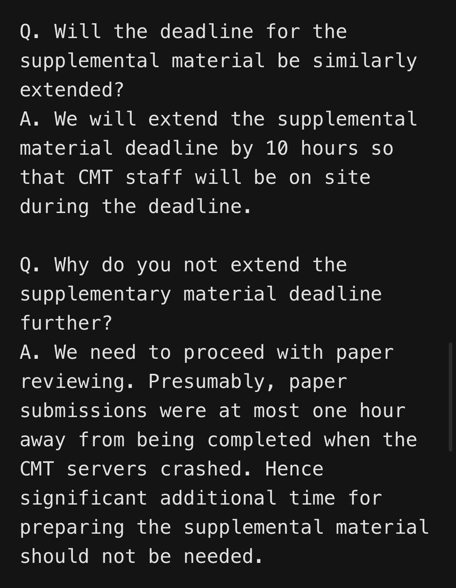 A. 我们需要继续进行论文审查。据推测,当CMT的服务器崩溃时,距离论文提交的截止时间最多只有一个小时。因此,应该不需要大量的额外时间来准备补充材料。
