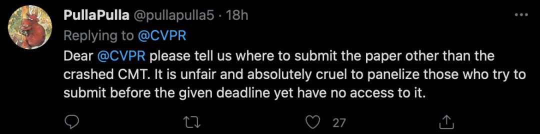 赶着DDL提交论文的同学义愤填膺地表示:「亲爱的CVPR,请告诉我们除了崩掉的CMT之外,还有哪里可以提交论文。要不然,在给定的截止日期前,却不能提交论文,这是不公平的,对赶论文的同学来说太残酷了。」