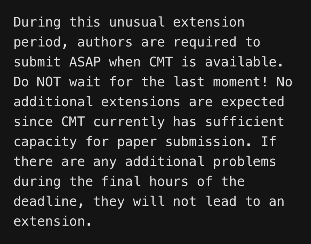 在这个不寻常的延长期,作者需要在CMT可用时尽快提交。请不要等到最后一刻!由于CMT目前有足够的能力可以接受论文提交,所以预计不会有更多的延期。如果在截止日期的最后几个小时有任何额外的问题,将不会再次延期。