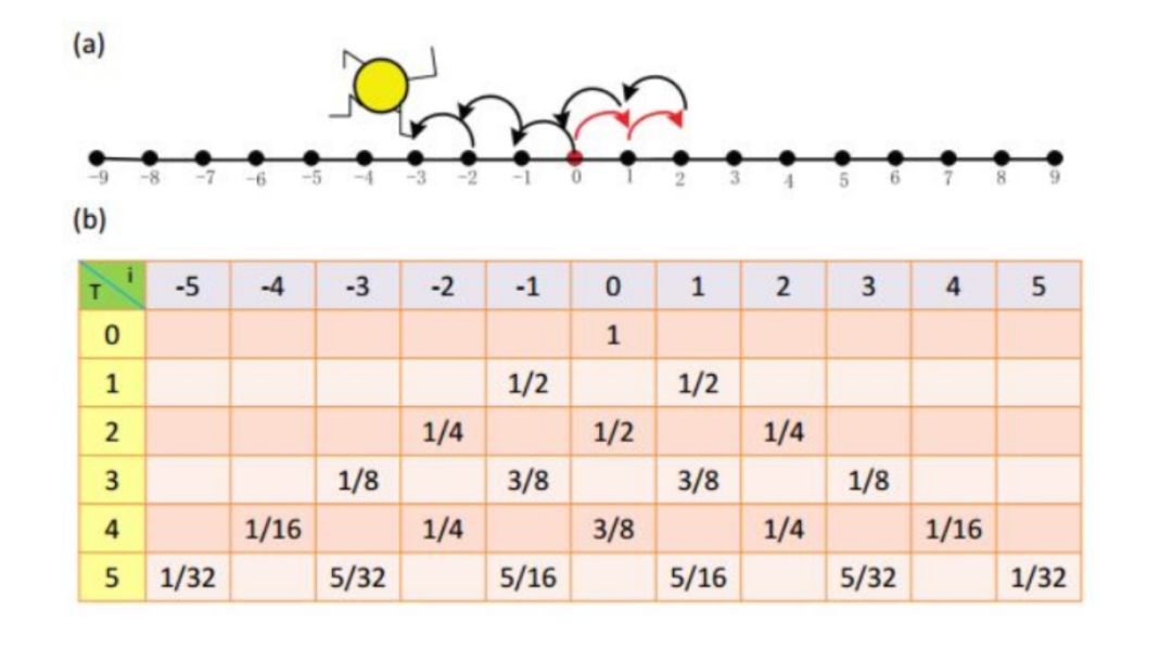 图一 | 一维晶格上,行走者可以通过投掷硬币来决定两个行走的方向。(b) 一维晶格上经过 T 次行走之后行走者所处的状态。可以看出,行走者处于中间的位置大于处于两端的概率