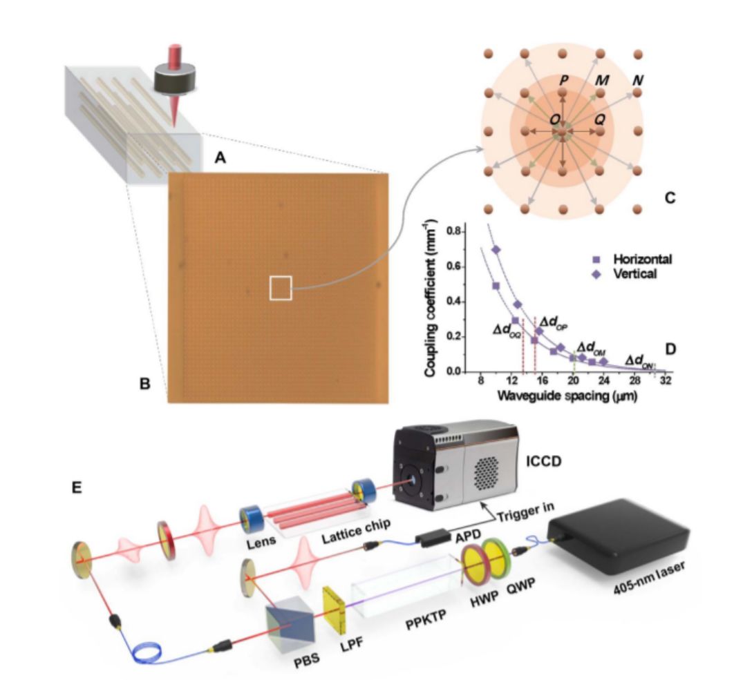 图二 | 实验装置示意图 (a) 飞秒激光直写技术制备的三维波导阵列。(b) 实验上所用到的光子晶格横截面。(c) 一个波导耦合另一个波导示意图。(d) 垂直和平行方向,两个波导耦合系数随着距离变化的变化趋势。(e)单光子实验装置。APD:雪崩光二极管。PBS:极化分束器。HWP:半波片。QWP:1/4波片。LPF:低通滤波器。PPKTP:周期极化KTP晶体
