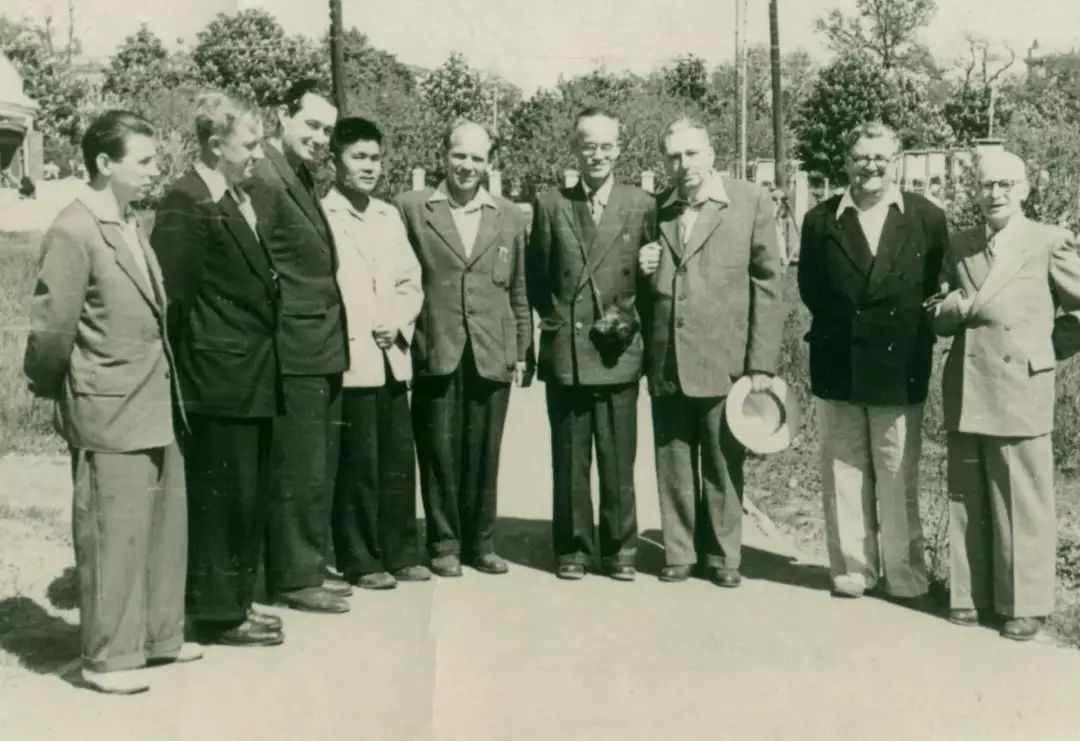 ▲1958年中国科学院老学部委员张钰哲(右4)参加苏联科学院的行星天文学会议时郝柏林(左4)担任翻译