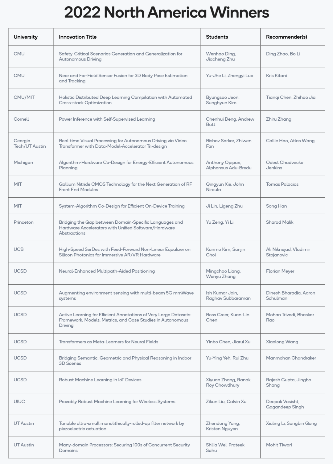 2022 年高通创新奖学金获得者(Qualcomm Innovation Fellowship Winners)北美获奖名单现已公布,共有 38 人获奖。该奖项创始于 2009 年,至今已有 14 年。在今年的获奖名单中,华人学生占据一半名额。
