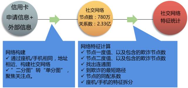 以银行信用卡申请反欺诈为应用场景,详细描述社交网络构建、特征处理、算法实现、运行结果分析等阶段过程。