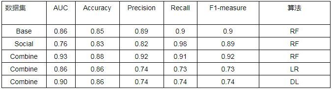 后面三组数据是在整合数据集上应用三种不同算法,整体表现逻辑回归算法较弱,深度学习居中,随机森林表现最优。结果表明目前模型输入特征与预测目标关联性较好,并且总体特征数量为数十个的量级,还不足以发挥深度学习海量特征无监督优化选择的特性,相比之下随机森林、GBDT[10]等集成学习算法表现更为突出。