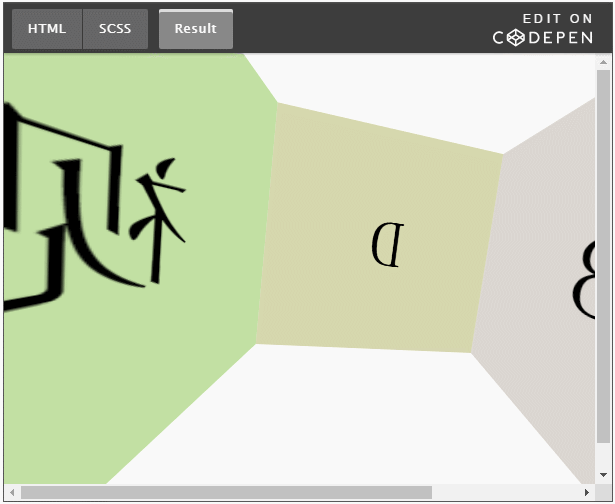 最好能点进去看看(http://codepen.io/Chokcoco/pen/mAyRGv),这里我使用了带背景色的 div 作为示例,我们的视角处于一个正方体中,正方体的旋转动画让我们有了 3D 的感觉。