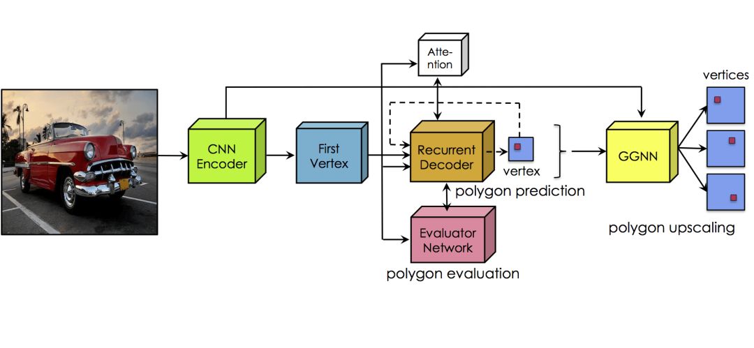 和之前的Polygon-RNN类似,Polygon-RNN++使用了CNN(卷积神经网络)提取图像特征,然后使用RNN(循环神经网络)解码多边形顶点。为了提高RNN的预测效果,加入了注意力机制(attention),同时使用评估网络(evaluator network)从RNN提议的候选多边形中选出最佳。最后使用门控图神经网络(Gated Graph Neural Network,GGNN)上采样,以提高输出分辨率。
