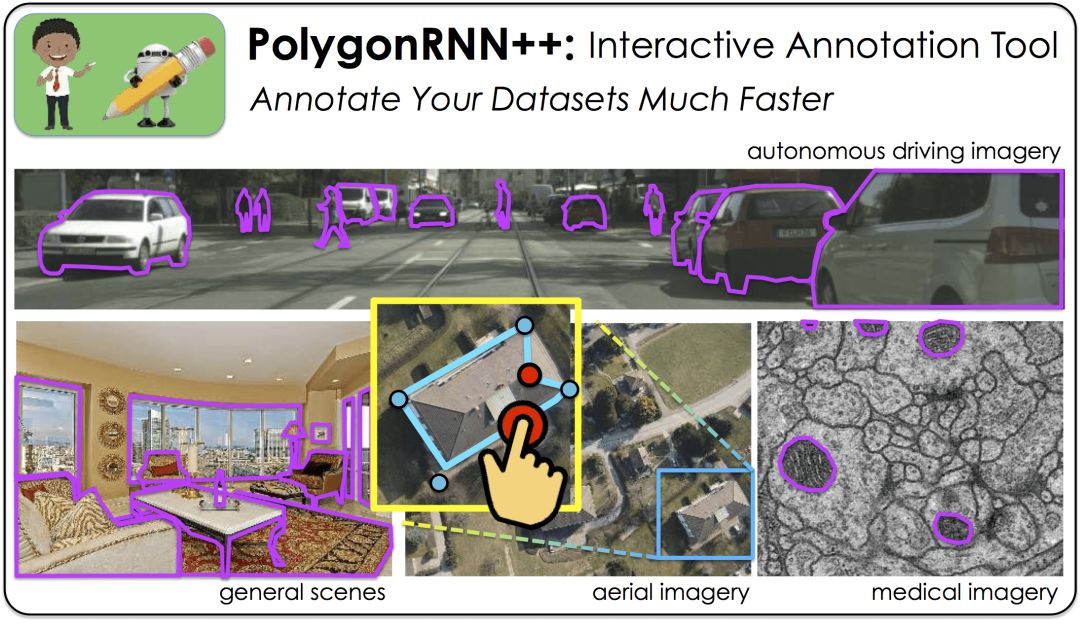 标注图像中的物体掩码是一项非常耗时耗力的工作(人工标注一个物体平均需要20到30秒),但在众多计算机视觉应用中(例如,自动驾驶、医学影像),它又是不可或缺的。而现有的自动标注软件,大多基于像素,因此不够智能,特别是在颜色接近的相邻物体上表现不好。有鉴于此,多伦多大学的研究人员Lluís Castrejón等提出了Polygon-RNN标注系统,获CVPR 2017最佳论文提名。多伦多大学的研究人员David Acuna、Huan Ling、 Amlan Kar等又在CVPR 2018提交了PolygonRNN++,Polygon-RNN的改进版本,并于近日发布了PyTorch实现。
