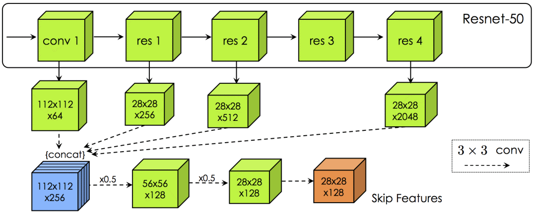 CNN部分,借鉴了ResNet-50的做法,减少步长(stride),引入空洞卷积(dilation),从而在不降低单个神经元感受野(receptive field)的前提下,放大输入特征映射。此外还引入了跳跃连接(skip connection),以便同时捕捉边角等低层细节和高层语义信息。剩下的配置都是比较常规的,包括3x3卷积核、组归一化(batch normalization)、ReLU、最大池化(max-pooling)等。