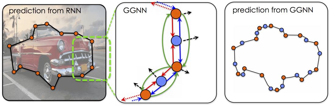 如前所述,RNN输出的D x D维的多边形,D取28. 之所以不取更大的D,是为了避免超出内存的限制。为了增加最终的输出分辨率,Polygon-RNN++使用了门控图神经网络进行上采样,将顶点视作图的节点,并在相邻节点中间增加节点。