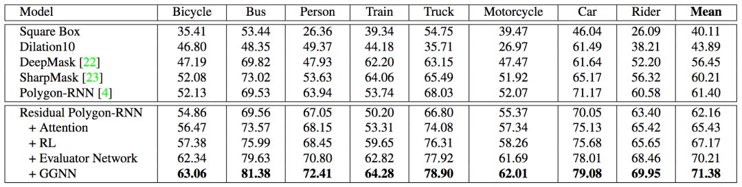 可以看到,在各个分类上,Polygon-RNN++都超越了其他模型,并且高于其中表现最好的模型差不多10%的IoU。事实上,在汽车(cars)分类上,Polygon-RNN++(79.08)战胜了人类(78.60)。而消融测试的结果也令人满意。