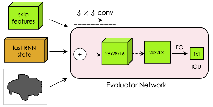 第一个顶点的选择很关键,特别是在有遮挡的情况下。传统的集束搜索基于对数概率,因此不适用于Polygon-RNN++(在遮挡边界上的点一般在预测时会有很高的对数概率,减少了它被集束搜索移除的机会)。因此,Polygon-RNN++使用了一个由两个3x3卷积层加上一个全连接层组成的评估网络: