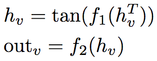 上式中,V为图的节点集,xv为节点v的初始状态,hvt为节点v在时步t的隐藏状态。矩阵A ∈ R|V|x2N|V|决定节点如何互相传递信息,其中N表示边的类型数。在试验中使用了256维GRU,传播步数T = 5。