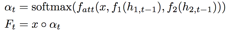 为了提升RNN部分的表现,加入了注意力机制。具体来说,在时步t,计算加权特征映射: