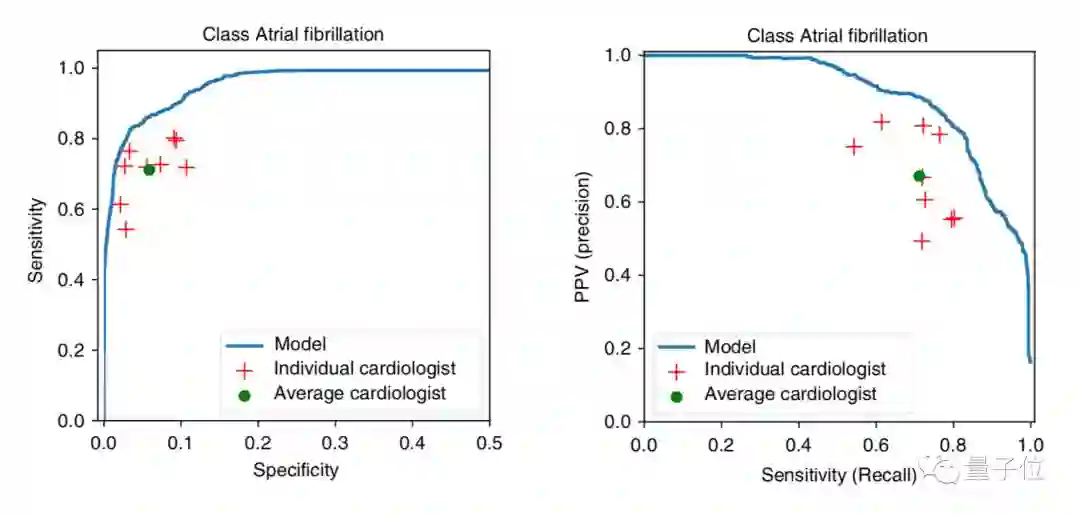 这是心房震颤的ROC曲线,红十字是不同人类医生的表现,绿点是人类医生的平均水平,已然被这个深度学习模型所超越。