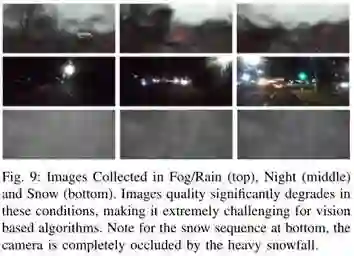 为了验证算法在极端天气的鲁棒性,本文作者采集了在雨、雪、大雾、夜间等非常有挑战的数据。数据采集车装备有GPS, IMU导航系统,一个Velodyne HDL-32 激光雷达,一个ZED双目相机,一个NavTech 雷达扫描仪。NavTech最大距离是100m,分辨率 0.1736 pixel/m, 和Oxford Radar Dataset中的有点不同。