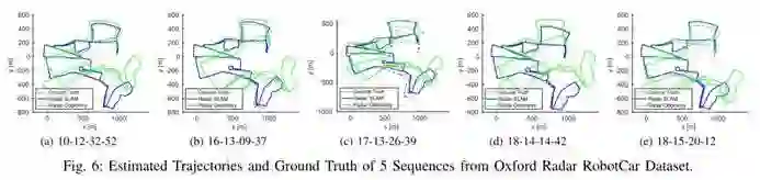 RadarSLAM 是使用C++实现的,没有使用GPU的情况下,在Intel i7 2.60GHz CPU上,16GB RAM上的笔记本运行速度是6Hz。一个37分钟的序列(约9000幅图像)是实时的。