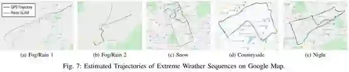 极端天气下的位姿估计结果见下。从实验结果来看,在所有的传感器中,只有雷达系统可以在所有天气状况下可靠的定位。