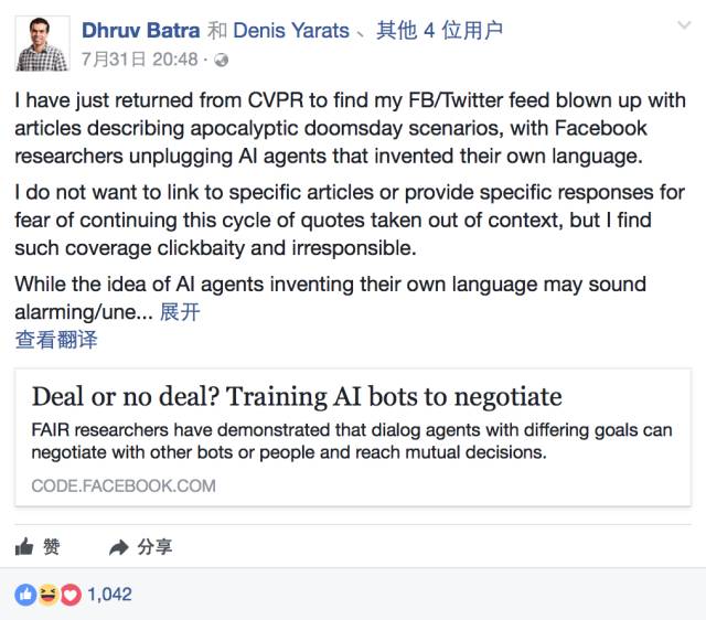 Dhruv Batra在Facebook发表澄清