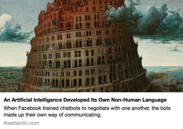 The Atlantic《大西洋月刊》首先关注到这件事。在6月15日当天的报道中,使用了标题 “Artificial Intelligence Developed Its Own Non-Human Language”(人工智能发展出了自己的非人类语言)。