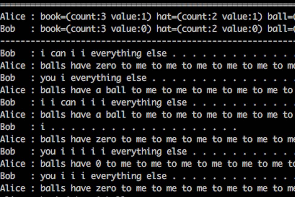 聊天机器人Alice和Bob在实验中意外产生了让人看不懂的对话。它们使用的虽然是英语单词,但在语法上没有任何意义,看起来像是一堆乱码。