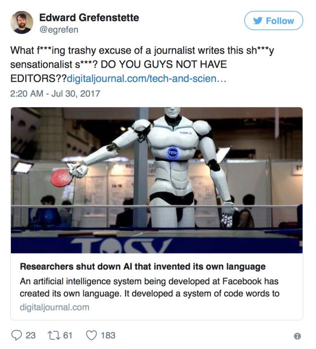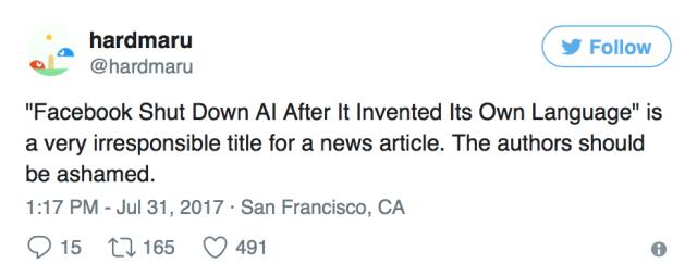 另一位研究员hardmaru发推文表示,“《自AI发明了自己语言后Facebook关闭了它》这篇报道的题目非常不负责任,作者应该对它感到羞耻”。