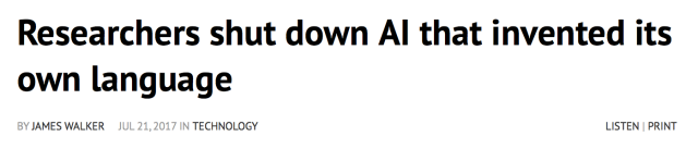 之后,Fast Co. Design和Digital Journal发表文章,强调研究人员在发现AI机器人不再使用常规英语后,紧急“关停”了这一项目。
