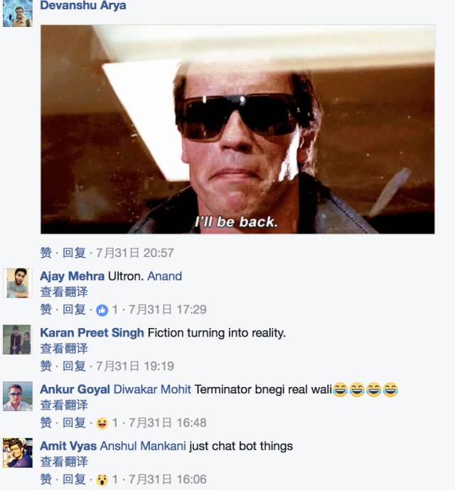 这些报道在网络上引发了公众的兴趣。在Facebook主页的相关新闻下,留言中大量出现《终结者》、《复仇者联盟》中的“奥创”等人工智能机器人大反派的名字。大家都在猜测,传说中的奇点是不是已经到来了?