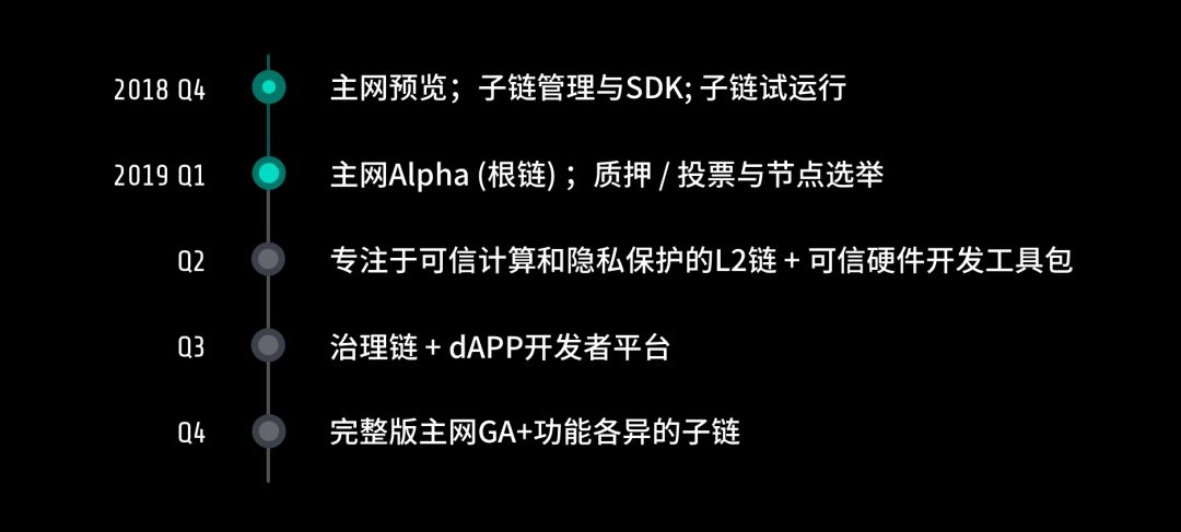 2019将是IoTeX密集发布技术和产品的一年。让我们来看下2019年IoTeX的路线图:我们将以功能健全、运行稳定的根链为基础,逐步添加新的L2链(如可信计算,IoT设备中心),开源工具(SDK,浏览器,钱包)和dApp / 服务(DEX,稳定币,预言机)。IoTeX开发者和用户社区将作为最重要的核心参与建设和推动生态进化。