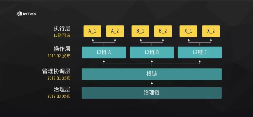 主网Alpha只是一个开始。如下图所示,IoTeX的宏伟蓝图使用了多层结构搭建职责分明的区块链组织架构:引力治理链(去中心化治理),基础根链(管理和协调),L2链(执行和计算)。