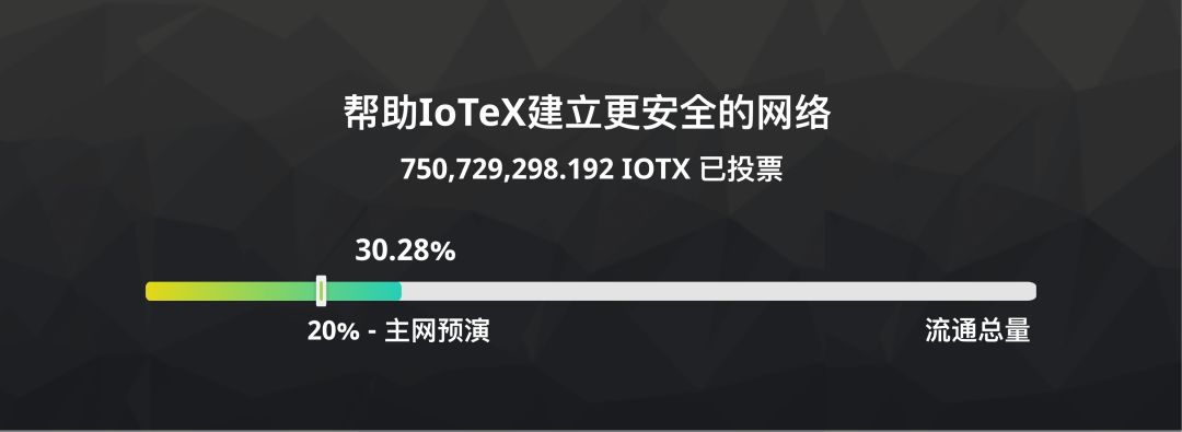节点投票于3月11日开启,设立参与质押/投票的最低目标为现流通通证总量的20%(约5亿IOTX),以保证安全启动主网。这个目标在投票开始后的一周内就已迅速达成,感谢所有参与投票的社区成员,我们又一次见证了IoTeX社区高参与度与贡献度所带来的巨大力量!现在,距离主网Alpha上线还有几天的时间,已经有超过7.5亿通证参与了质押/投票活动(超过通证流通总量30%)。如果还没有参与到投票活动中,快来为您青睐的节点投出宝贵的一票!