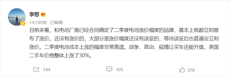 3月19日,理想汽车 CEO 李想通过社交媒体表示,目前来看,和电池厂商已经合同确定了二季度电池涨价幅度的品牌,基本上就都立刻宣布了涨价。