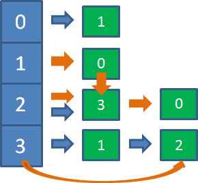 要想查出顶点0能够到达的所有相邻节点,也很简单,从顶点0向后的所有链表节点,就是顶点0能到达的相邻节点。