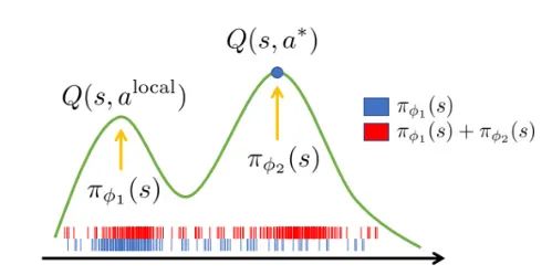 图2:Double actors帮助智能体逃离局部最优。图中绿色曲线为真实Q值的分布示意,蓝色竖线表明使用单个actor得到的分布采样点,而红色竖线表示double actors得到的分布采样点。