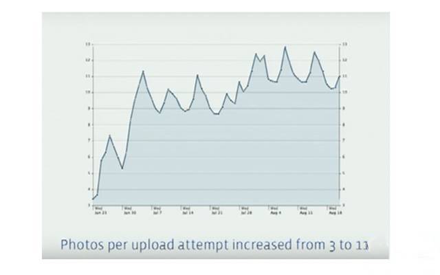 不仅如此,每个用户平均上传的照片张数从 3 张,上升到了 11 张。但是从上传的波峰来看,大多数用户会在周末集中上传多张照片。