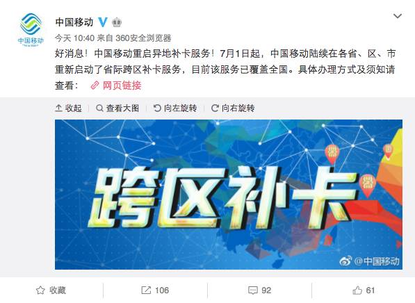 中国移动重新开启异地补卡服务
