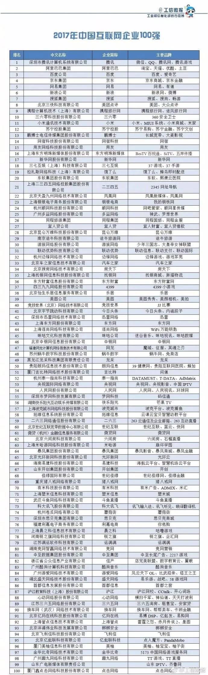 中国互联网企业 100 强榜单公布:BAT 稳居前三