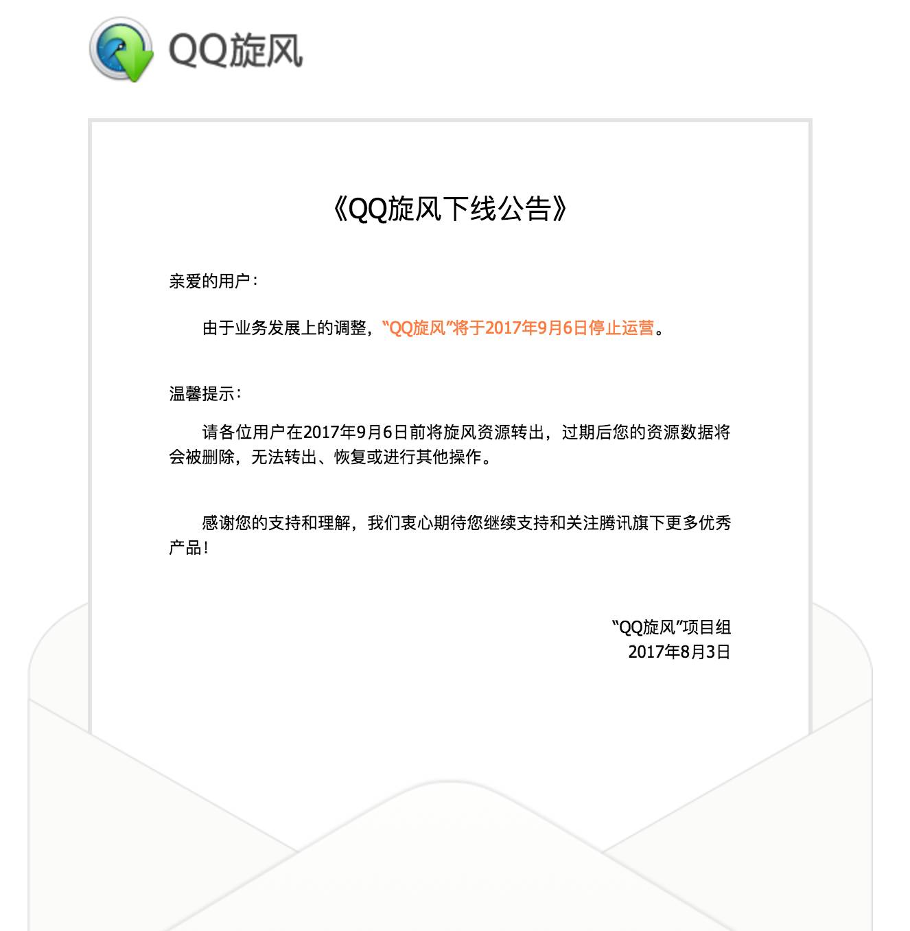 今天,QQ 旋风在其官方宣布“由于业务发展上的调整,“QQ旋风”将于 2017 年 9 月 6 日停止运营。” 9 月 6 日后过期后用户存储在 QQ 旋风中的资源数据将会被删除,无法转出、恢复或进行其他操作。