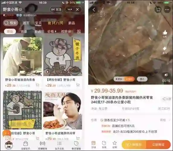 与李子柒的店铺较为接近的是同为美食达人的“野食小哥”。据了解,他也开了自己的淘宝店铺,名字就是“野食小哥”,但在定位上没有特别强烈的品牌属性,售卖的产品主要是休闲零食。