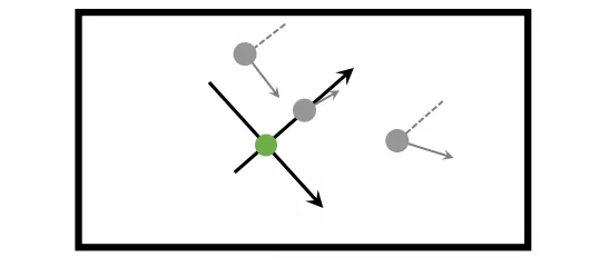 绿点代表了跟踪器,灰点代表了不同位置和朝向(箭头指向)的目标,虚线与跟踪器的 y 轴相平行。