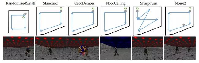 Vizdoom 环境的地图和示例。其中,绿色点代表跟踪器(箭头代表方向),灰色点代表目标, 蓝线代表规划的目标的路径,黑线代表墙壁。最左边的场景为训练环境,其余场景为测试环境,包含了不同的目标轨迹、目标外观、背景颜色,以及干扰物体等情况。