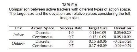 通过上表可见,采取离散动作的跟踪器在两个场景中都可以取得更高的成功率。在室外,离散动作可以让目标大小保持更加稳定(更小的方差)。无论是室内室外,基于离散动作的跟踪器都能保证更小的平均偏差。综合这些结果,说明了采用离散动作可以帮助模型更好更鲁棒地迁移到真实场景。我们猜想对动作空间离散化可以使得智能体对场景中的干扰和机器人控制系统的噪声都更加鲁棒,而连续空间会更加敏感。